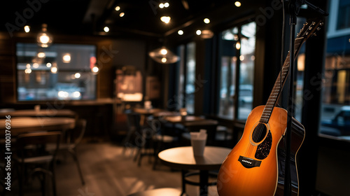 Cafe interior with guitar and soft morning light