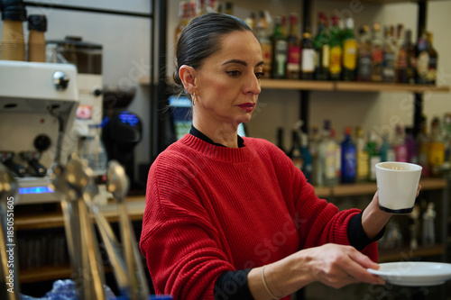 Cafeteria Owner In Red Sweater Serves Coffee In Cozy Caf? Setting With Bottled Spirits On Shelves