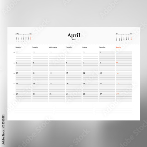 Calendar Template for April 2017. Week Starts Monday. Design Print Template. Vector Illustration Isolated
