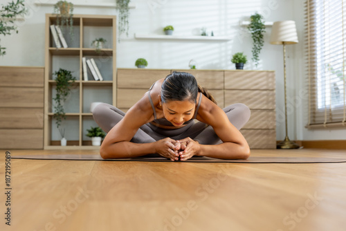 Calm Asian woman practicing yoga exercise stretching body on mat feeling relaxed peaceful in home living room health wellness fitness