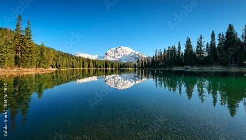 calm lake with a perfect reflection of pine trees and a snow capped mountain under a clear sky