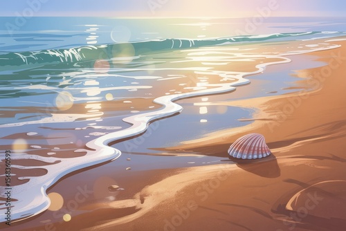 Calm Seashells on Warm Sand Beach with Gentle Waves and Sunlight Reflection Effect