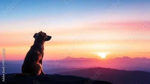 Calm silhouette of a dog on a hill overlooking a vibrant sunset landscape Generative AI