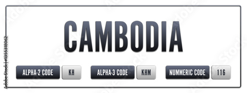 Cambodia. Illustration with ISO 3166-1 Country Code. ISO Alpha-2, Alpha-3 and Numeric code. Two three letters and numbers.