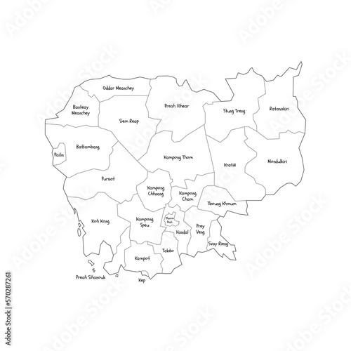 Cambodia political map of administrative divisions - provinces and autonomous municipality of Phnom Penh. Handdrawn doodle style map with black outline borders and name labels.