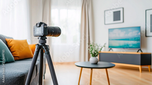 Camera and Tripod Setup for Capturing Interior Home Ambience with Modern Decoration Elements