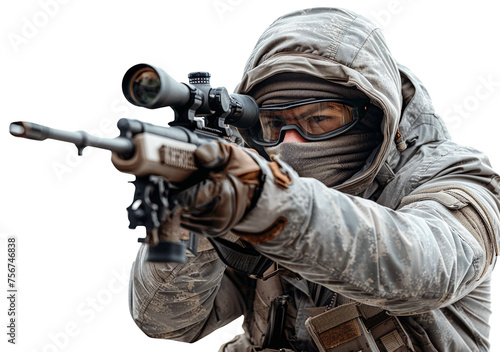 Camouflaged soldier aiming with precision and focus, cut out - stock png.