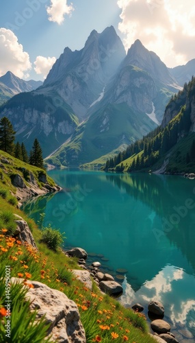 Campa?a tienda amarilla montada cerca de un lago en paraje natural con puesta de sol dorada, sol, iluminaci?n
