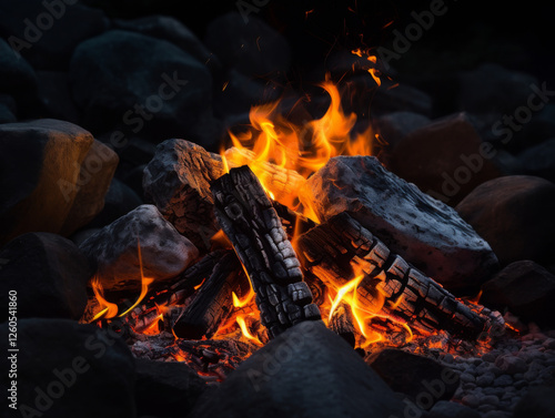 Campfire crackling among stones at night in a tranquil outdoor setting