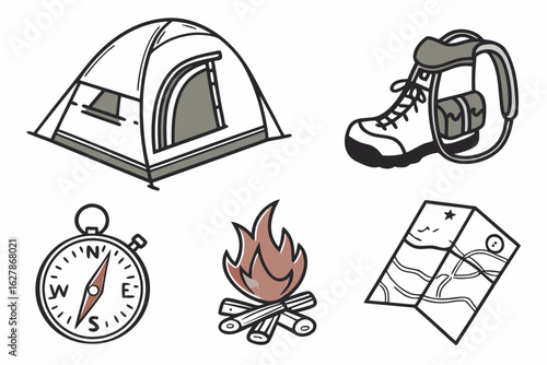 Camping and hiking gear icons isolated on white background