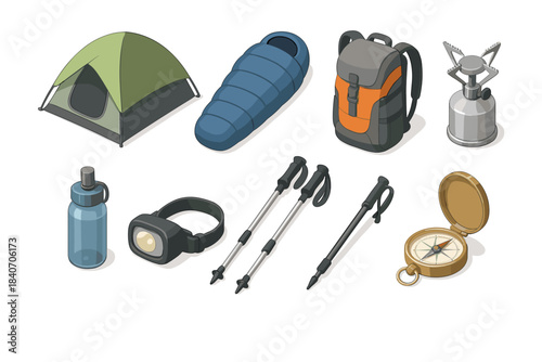 Camping equipment: tent, sleeping bag, backpack, and hiking gear essentials
