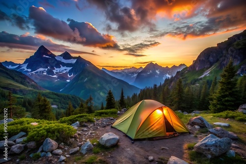 Camping Under the Mountains at Sunset.