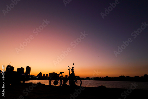 Campos dos Goytacazes, RJ, Brazil, 08/19/2023 - Woman and child with a bike in silhouette at sunset