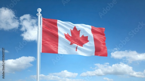 Canadian flag waving against clear blue sky with soft daylight and dynamic motion ideal for patriotic visuals, national holidays, government campaigns and international diplomacy