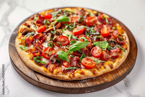 Canadian Pizza or Regina with Bacon, Tomatoes, Boletus Mushrooms, Fresh Basil, Tomato Sauce