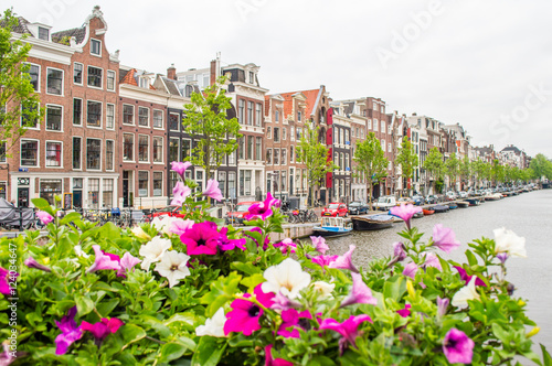 Canal, flowers and typical Amsterdam buildings, Netherlands