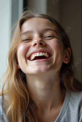 Candid Documentary Portrait of Joyful Young Woman in 20s Laughing with Deep Dimple, Genuine Unguarded Expression and Natural Teeth, Soft Window Daylight Close-up