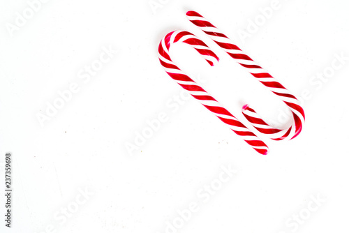 Candy canes on a white surface, top view, place for text