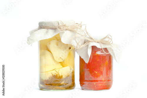 Canned vegetables in glass jars isolated on white background