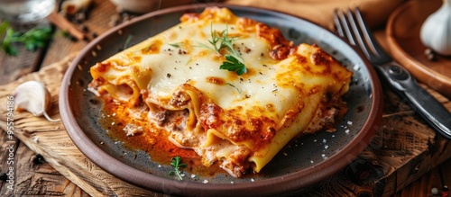 Cannelloni Pasta Filled With Meat Served With Bechamel Sauce On Ceramic Plate