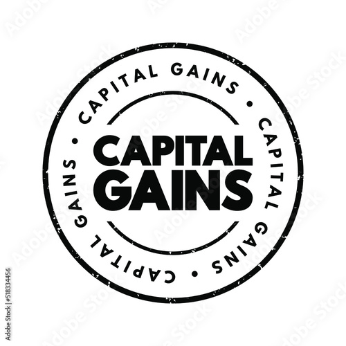 Capital gains - increase in a capital asset's value and is realized when the asset is sold, text concept stamp