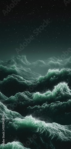Captivating dark green waves shrouded by a starry night sky create a serene minimalist wallpaper