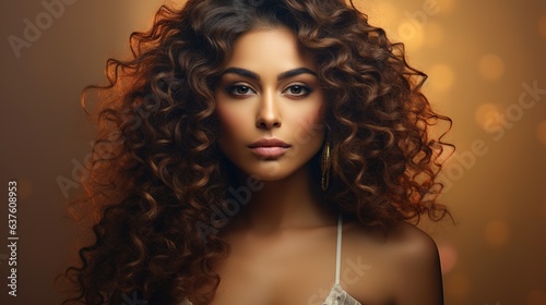 Captivating Gaze: A striking portrait of a young woman with voluminous brown curls cascading down her shoulders, her piercing gaze and delicate features illuminate her captivating beauty.