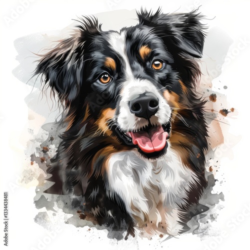 Captivating image of a dog with an open mouth and watercolor accents, evoking a feeling of playful innocence and artistic elegance.