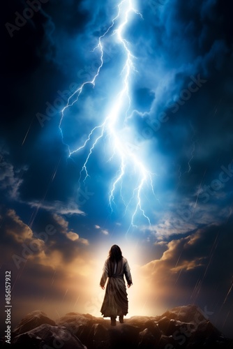 Captivating image of Jesus and a sudden bolt of lightning against a vivid blue sky, symbolizing power and divinity, rear view.