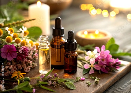 Captivating Laboratory Scene Showcasing Essential Oils for Natural Skincare, Aromatherapy, and Fragrance Products Surrounded by Delicate Flowers and a Bokeh Effect