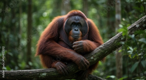 Captivating orangutan portrait, peacefully resting on branch within verdant jungle
