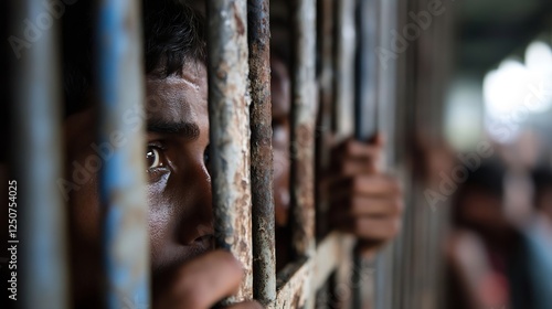 Captivating Portrait of a Young Man Gazing Through Jail Bars Evoking Feelings of Despair and Hope : Generative AI