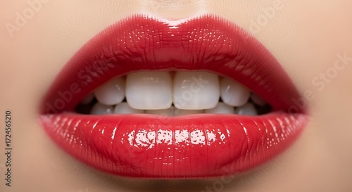 Captivating scarlet shine with pearly teeth, beauty close-up display