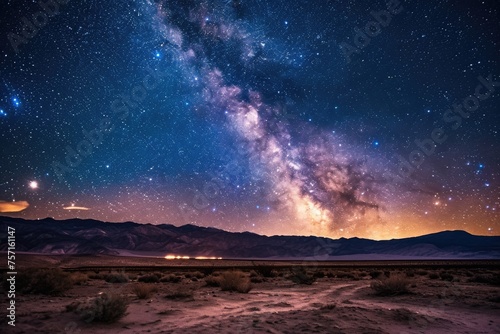 Captivating view of a night sky teeming with an array of bright stars, illuminating the darkness, A desert at night with a vivid Milky Way tableaux spread across the sky, AI Generated