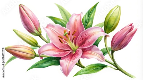 Capture the beauty of blooming pink lilies in watercolor. Ideal for cards and invitations, this illustration brings a touch of elegance and grace to any design.