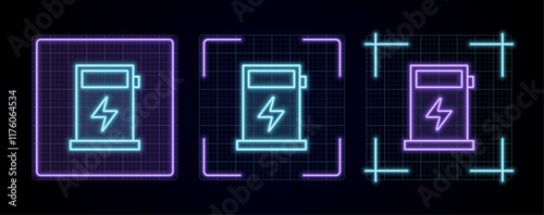 Car battery recharge icon illustration, cyber neon visual, glowing border grid vector.