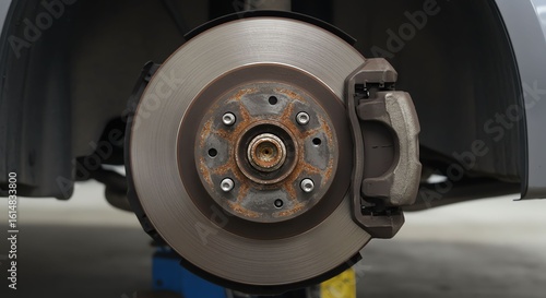 Car Brake Disc and Caliper Assembly on Vehicle Suspension System
