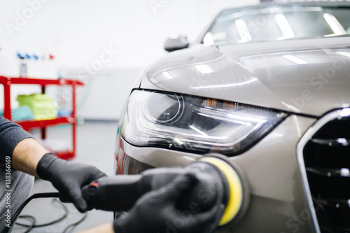 Car detailing - Hands with orbital polisher in auto repair shop.