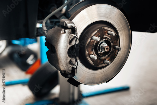 Car disk brake being repaired in a workshop