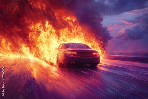 Car engulfed in flames on a road during a dramatic sunset with colorful skies