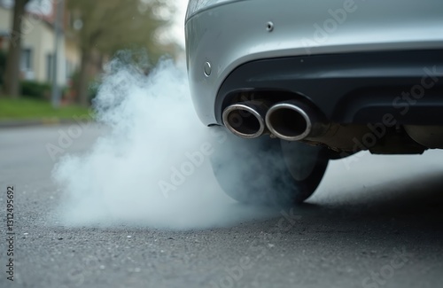 Car exhaust fumes pollute atmosphere. Toxic emissions from vehicle tailpipe cause air pollution, environ impact. Chemical combustion gases dirty urban environment. Auto industry problems. Hazard of