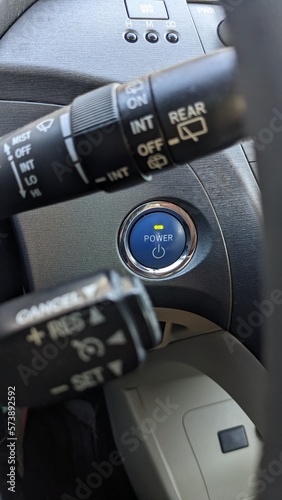 Car interior view of the front dashboard with instrument panel and steering wheel