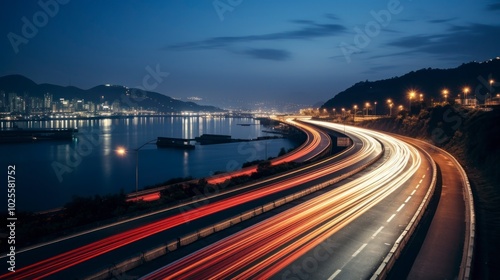 Car light trails on the road at night. Long exposure