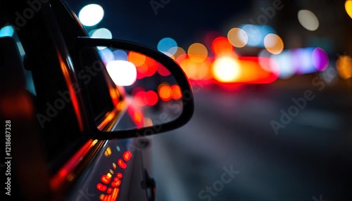 Car Mirror Reflecting City Lights At Night