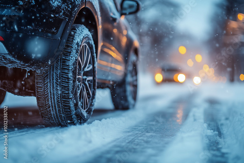 Car on a winter road with snow, close-up of car wheels in motion