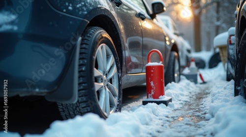 Car raised on jack with tire removed, antifreeze bottle and ice scraper visible, garage workshop environment, documentary lighting.