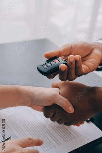Car salesman gave the keys to the customers who signed the purchase contract legally, Successful completion of car sales, Purchase contract and key delivery.