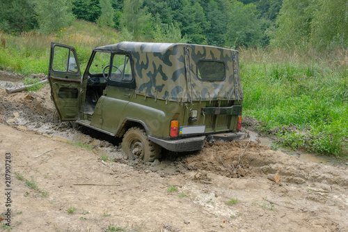 Car SUV 4x4 stuck in a puddle with mud, stalled.