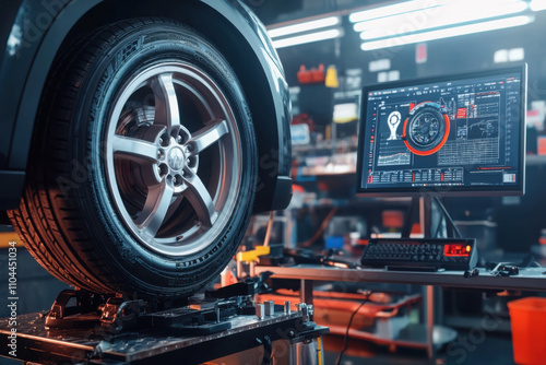 Car wheel centering machine adjustment. Auto service mechanic installing wheel alignment sensor on tire during vehicle suspension alignment adjustment