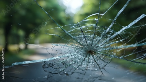 Car Windshield with Extensive Spiderweb Cracks and a Road with Greenery Visible